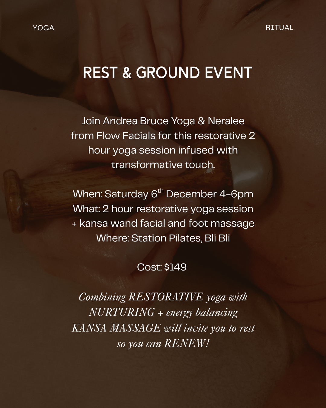 Join myself & Neralee from Flow Facials for an afternoon of restorative yoga and transformative touch. Across two spacious hours, you’ll be guided into deeply supportive restorative yoga shapes, while receiving a grounding kansa wand facial and foot massage.